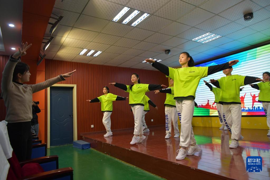 在江西省宜春市特殊教育學校,樊海艷(左一)指導聽障班的學生們排舞(12月28日攝)。