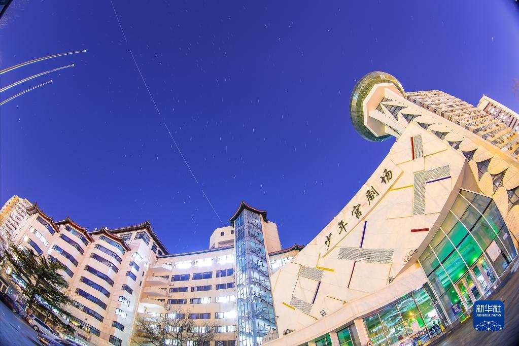 2021年12月16日,在北京市東城區少年宮拍攝的中國空間站過境照片(軌跡為多張照片堆棧)。