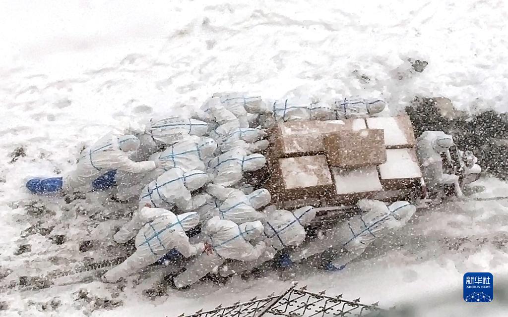 2021年1月6日,在為應對新冠肺炎疫情而封閉的大連海洋大學校園內,志愿者推著滿載的三輪車上坡,將物資送往學生宿舍。