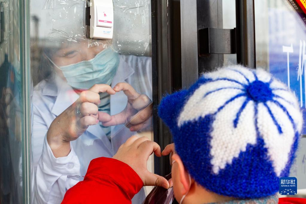 2021年2月11日,在黑龍江省哈爾濱市道外區一集中隔離點,鄭瑩瑩和兒子順順隔著玻璃門“比心”。鄭瑩瑩是哈爾濱市道外區人民醫院一名工作人員,正在一處集中隔離點值守。除夕上午,6歲的兒子順順來到隔離點,給她帶來了一朵康乃馨。因疫情防控需要,母子倆隔著賓館的玻璃門相望,完成了特殊的“除夕團圓”。