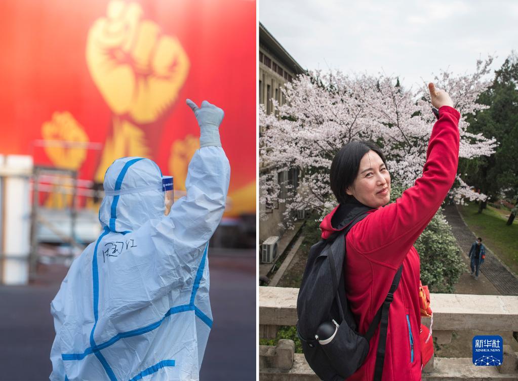拼版照片:左圖為2020年2月12日,安徽援鄂醫療隊隊員周國紅在武漢體育中心方艙醫院前豎起拇指為自己和同伴加油;右圖為2021年3月13日,周國紅參加武漢大學援鄂抗疫醫護人員賞櫻專場,在櫻花樹前拍照留念。