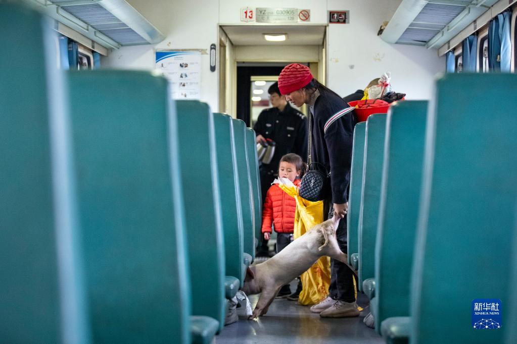 2021年4月11日,在5633次列車上,彝族乘客帶著的小豬從袋子里爬了出來。在成昆鐵路上,如今依然風雨無阻地行駛著平均時速不到40公里的5633/5634次列車,從普雄到攀枝花南全程共行駛11小時4分鐘,沿途???6個站?!奥疖嚒逼眱r幾十年不變,且遠低于公路票價水平,已成為沿途百姓外出務工、求醫就學、逢會趕集等的主要交通工具。