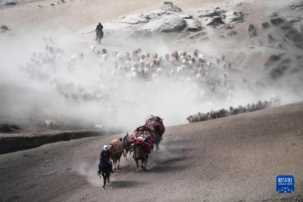 2021年6月5日,在新疆阿勒泰地區福??h沙爾布拉克春秋牧場的牧道上,牧民帶著駝隊,引著牲畜向夏季牧場遷徙。