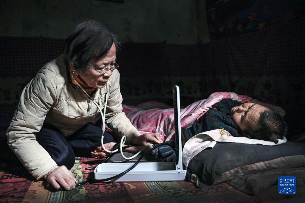 2021年1月18日,在陜西省榆林市佳縣店鎮賀家溝村農家窯洞里,路生梅跪坐在土炕上為癱瘓的村民喬愛芬義診。1968年,24歲的北京姑娘路生梅從北京第二醫學院(現首都醫科大學)畢業,只身來到千里之外的佳縣從醫。1999年,路生梅退休后,堅持留在佳縣為群眾義診。