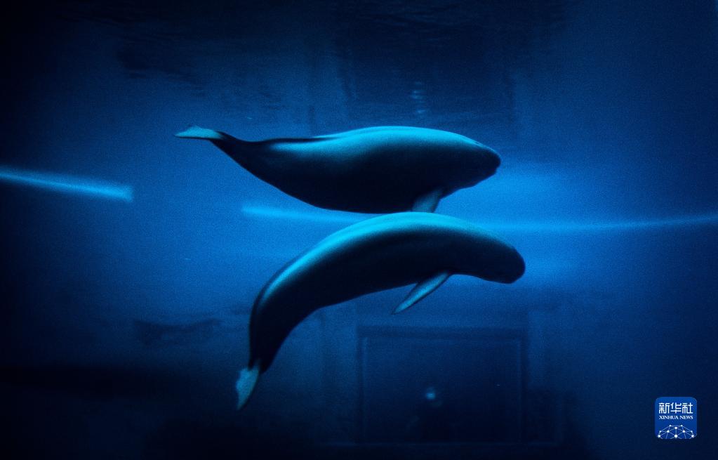 2021年7月5日,在中國科學院水生生物研究所白鱀豚館里,一對江豚母子在水中游弋。