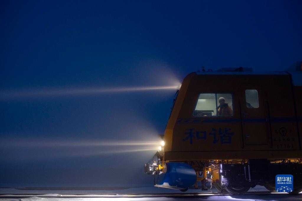 2021年1月21日,軌道除雪車載著工人緩緩駛出鐵廠溝維修工隊的車庫??耍死斠朗校┧ㄋ鞘校╄F路是新疆塔城地區的交通要道??怂F路穿越“魔鬼風區”瑪依塔斯。中國鐵路烏魯木齊局集團有限公司阿勒泰基礎設施段額敏綜合維修車間鐵廠溝維修工隊駐守在這里。他們24小時待命,負責鐵軌維修養護等工作,保障來往列車安全通行。