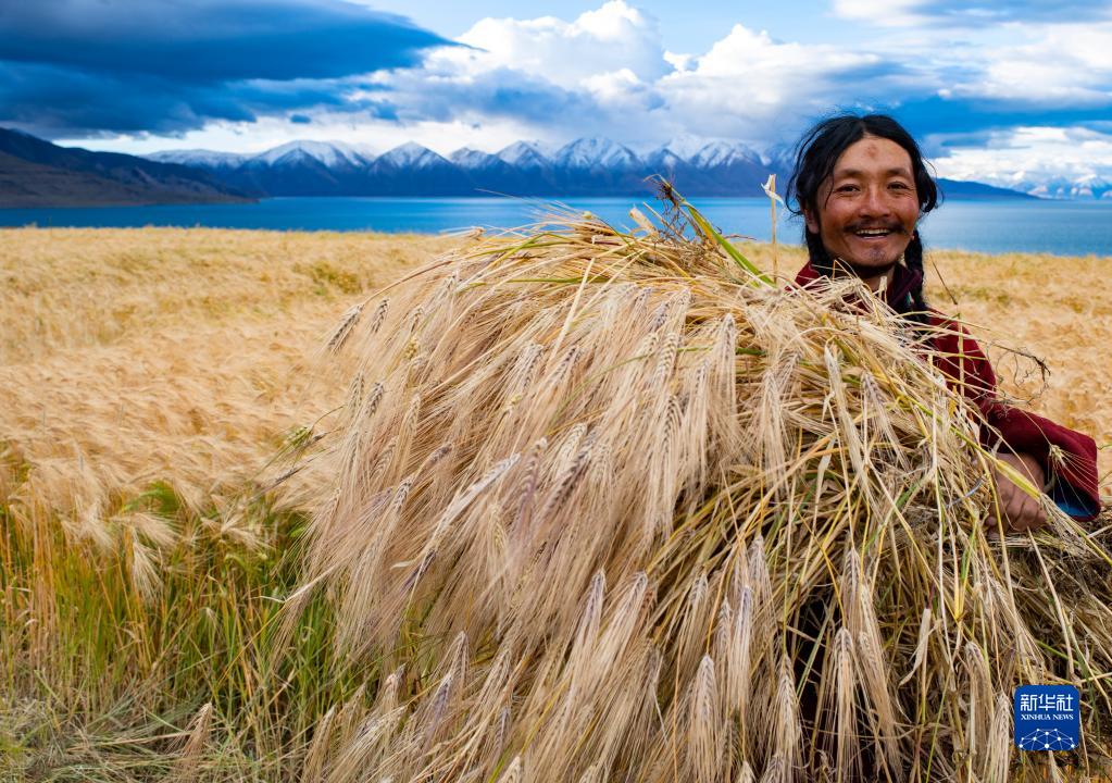 2021年9月23日,西藏那曲市尼瑪縣文部鄉文部南村村民開鐮收割。文部南村位于當惹雍措湖畔,海拔4645米,這里的村民以“薩馬卓”(半農半牧之意)為主,在藏北高原獨具特色。