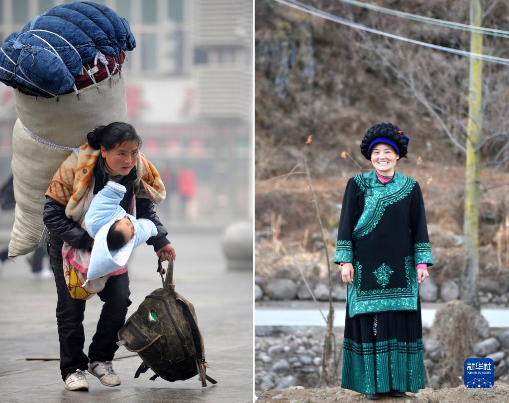 這是一張拼版照片。左圖為2010年1月30日,巴木玉布木背著大包、抱著孩子在南昌火車站匆忙趕車;右圖為2021年1月22日在四川省涼山彝族自治州越西縣瓦巖鄉桃園村拍攝的身著彝族服飾的巴木玉布木。