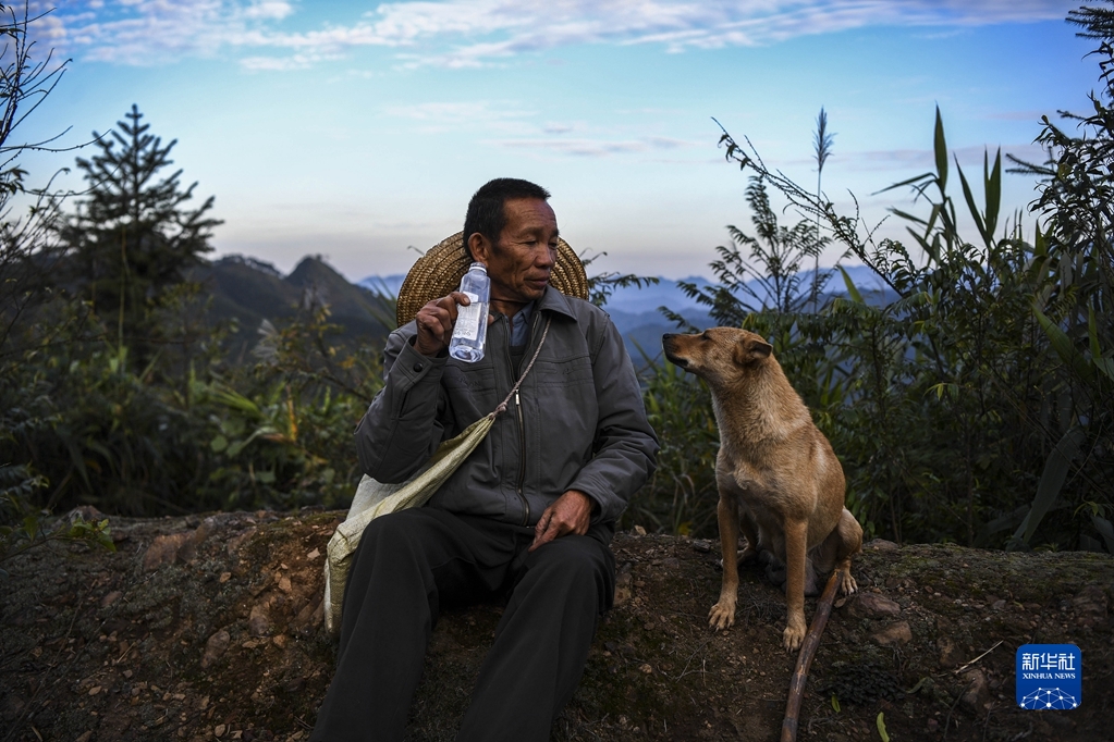 2021年11月24日,護林員雷其元在山頂休息。雷其元是廣西武宣縣東鄉鎮屯應村的一名村級護林員,管護著約5800畝公益林。