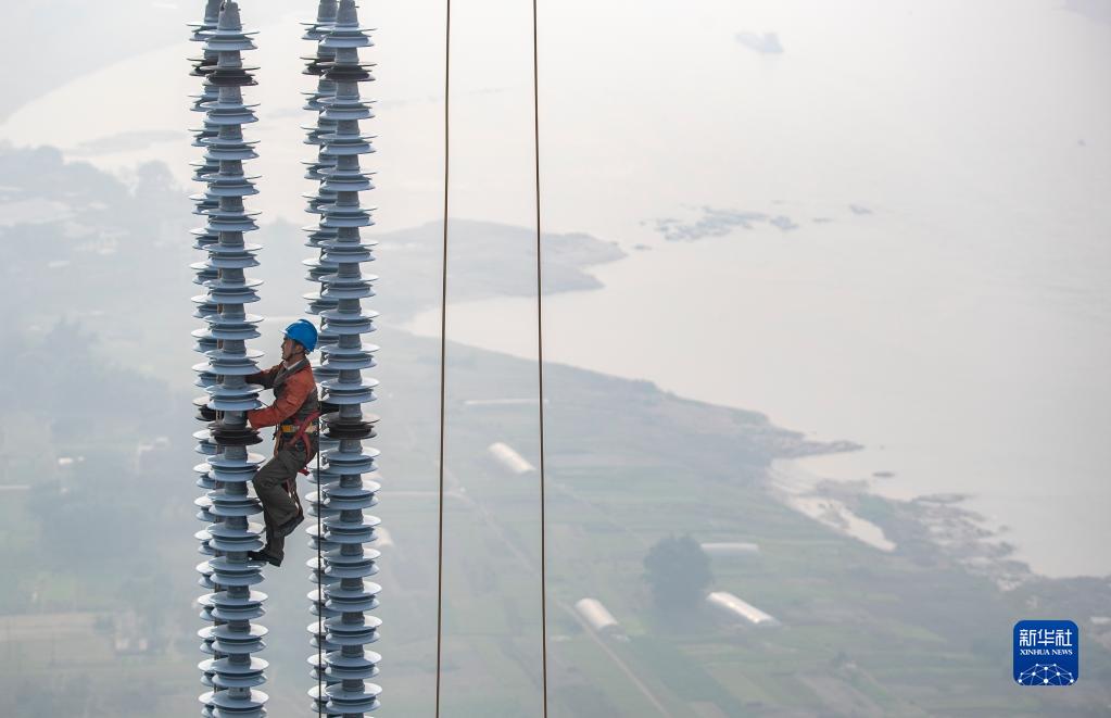 2021年12月5日,在白鶴灘—江蘇±800千伏特高壓直流輸電線路工程(重慶段)江津長江大跨越施工現場,工人在長江上空作業。