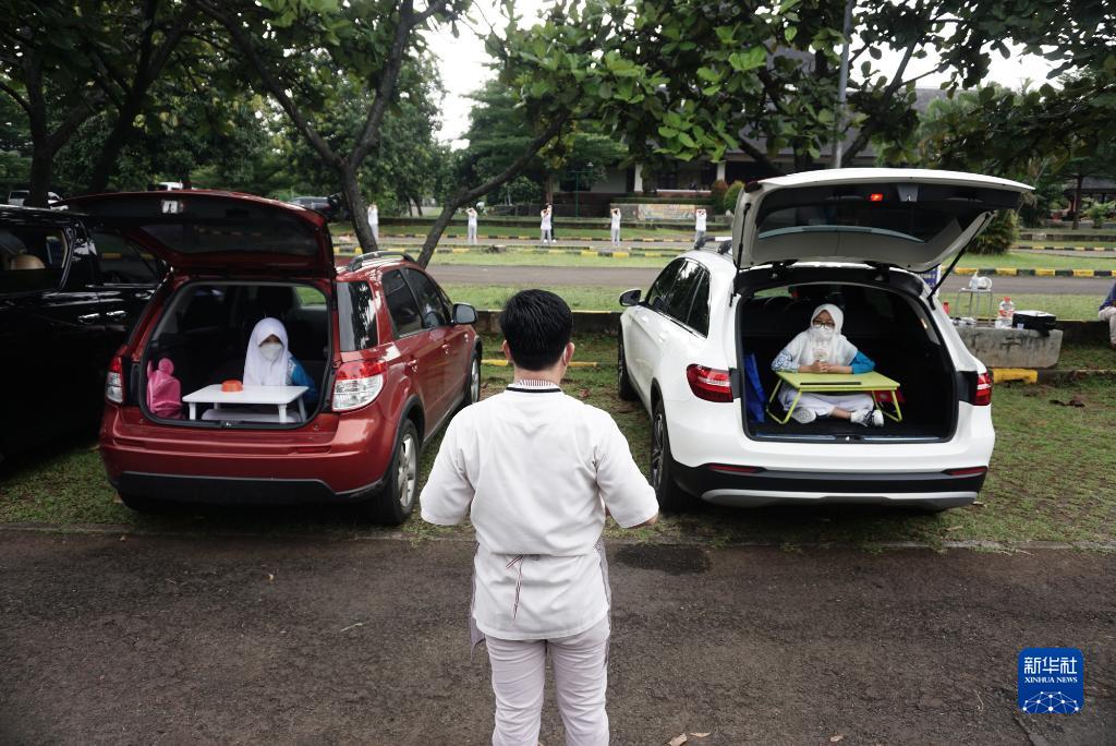 2021年4月5日,教師在印度尼西亞首都雅加達為在后備箱中學習的學生授課,在確保新冠防疫要求的情況下采取靈活方式進行面對面教學。