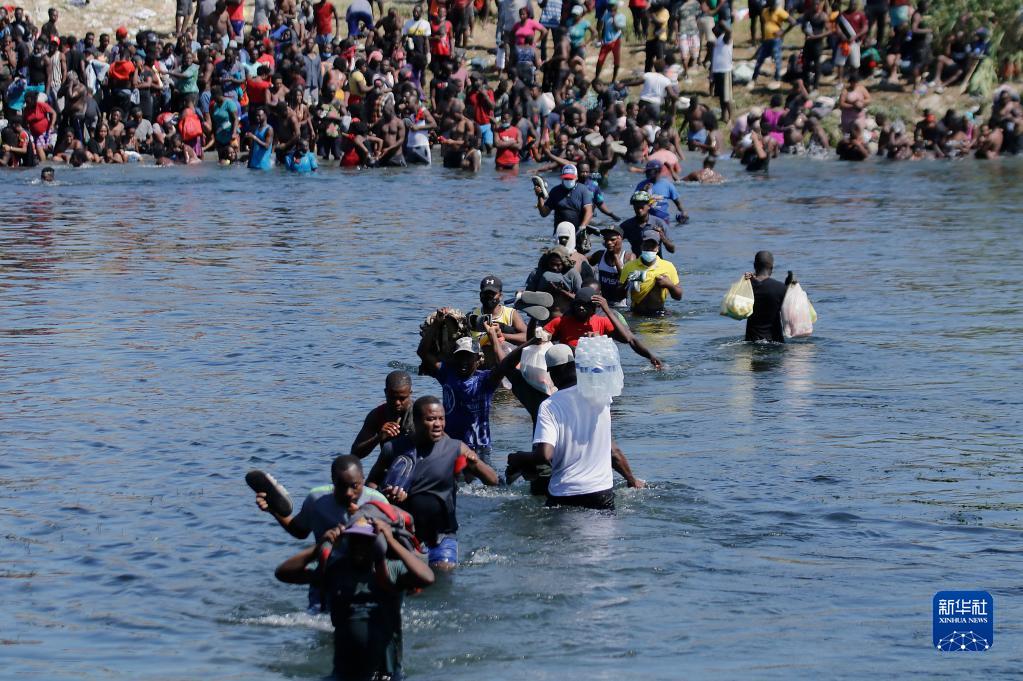 這張2021年9月19日從美墨邊境墨西哥科阿韋拉州阿庫尼亞城一側拍攝的照片顯示,購買物資的非法移民在里奧格蘭德河上往返。
