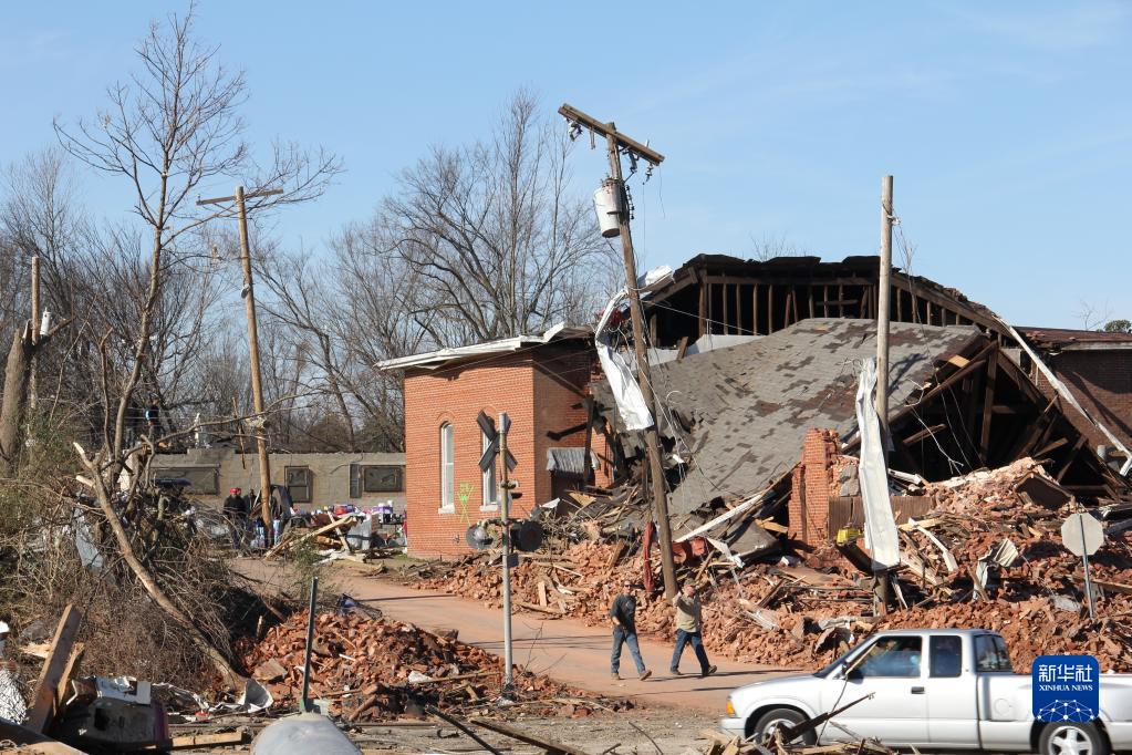 這是2021年12月14日在美國肯塔基州梅菲爾德拍攝的破損房屋。2021年12月10日晚至11日清晨,超過30場龍卷風襲擊了美國中部6個州,導致88人死亡,大量建筑損毀,基礎設施被破壞,經濟損失慘重。