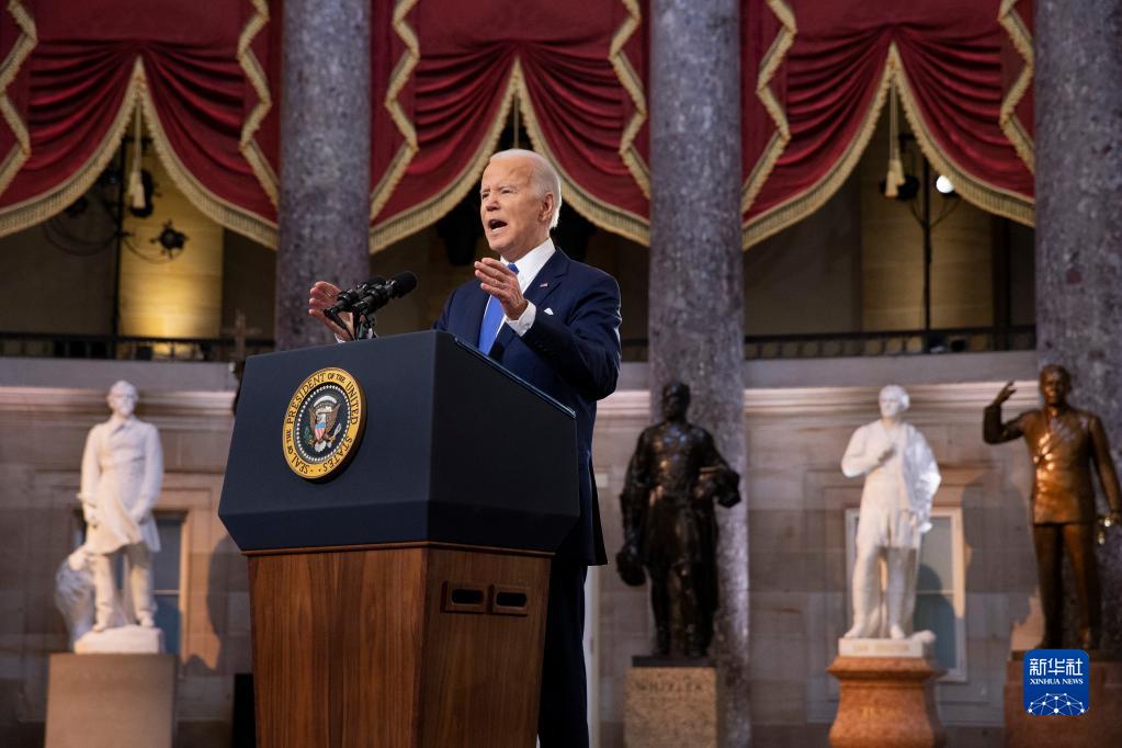 1月6日,美國總統拜登在華盛頓國會大廈發表講話,紀念國會山騷亂事件一周年。