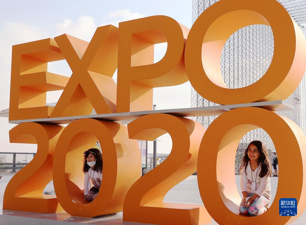 1月9日,兩名兒童在阿拉伯聯合酋長國迪拜世博園門口拍照。