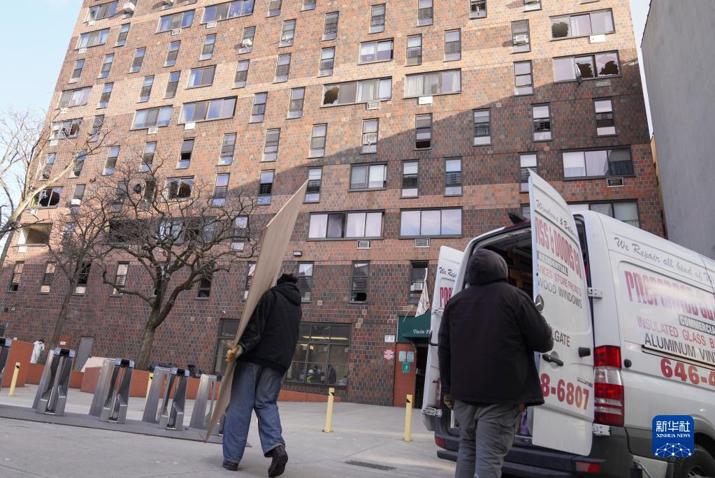 1月10日,工作人員在美國紐約市布朗克斯區發生火災的公寓樓外搬運木板。