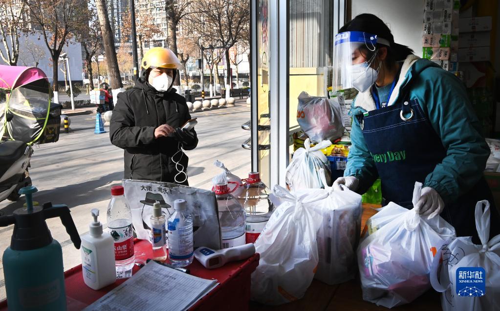 1月11日,外賣員在西安市碑林區南稍門一家便利店取貨。
