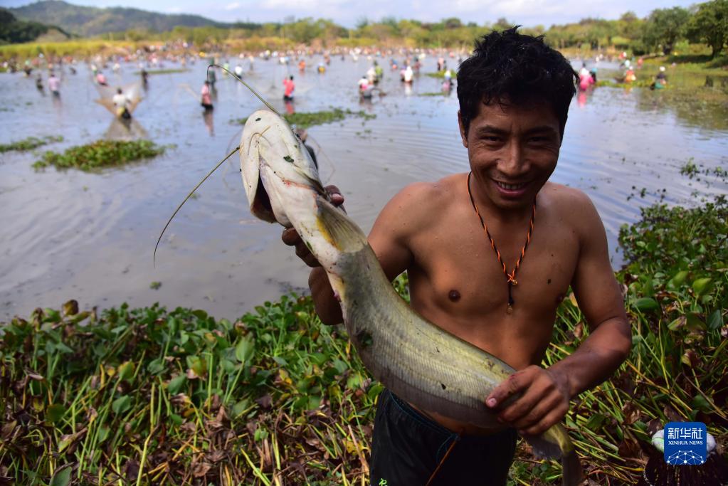 1月13日,在印度阿薩姆邦高哈蒂一處村莊,一名當地村民手捧漁獲。當日,村民參加捕魚活動,慶祝收獲季的結束。新華社發