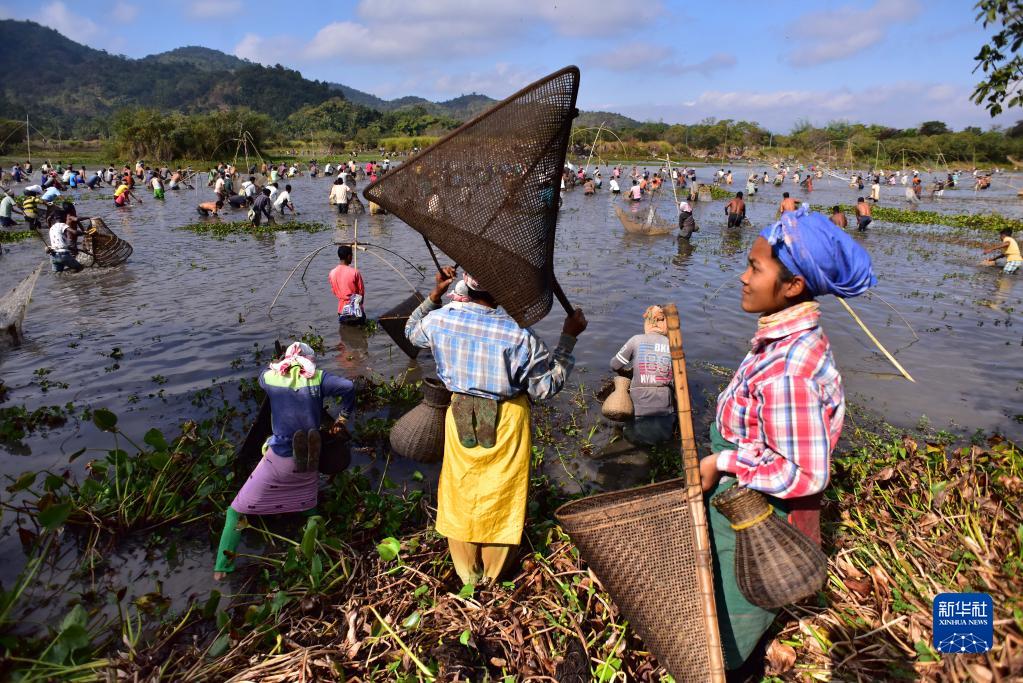 1月13日,在印度阿薩姆邦高哈蒂一處村莊,當地村民參加捕魚活動,慶祝收獲季的結束。新華社發