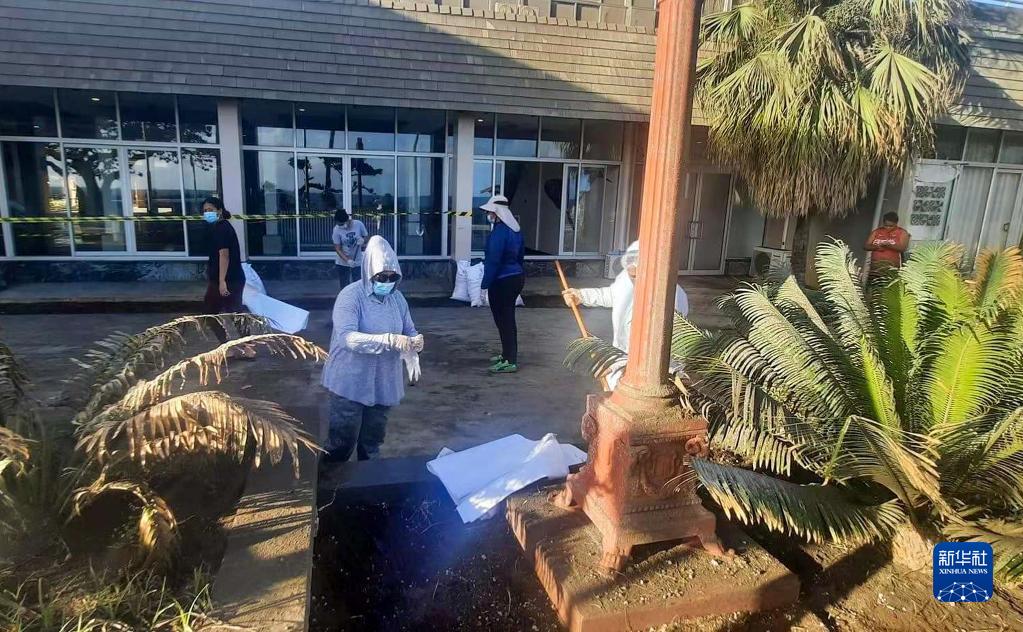 這是1月20日早晨在湯加首都努庫阿洛法拍攝的遭受海嘯侵襲后的街道和房屋。