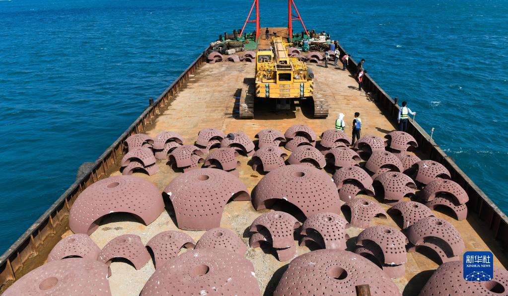近日,在海南省三亞市亞龍灣相關海域,三亞珊瑚礁生態研究所聯合相關企業,在該海域投放近80個人工生態礁,加速生態修復。