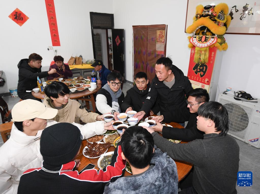 1月21日,在前童鎮橋頭楊村,童攀峰(站立者)在家里招待舞獅隊成員進行年度聚會。