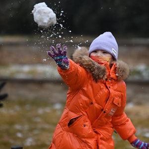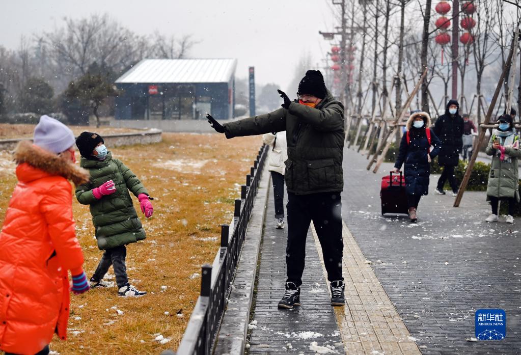 1月23日,小朋友在街頭與家人打雪仗。