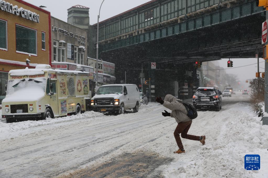 1月29日,一名行人在美國紐約穿過積雪的道路。
