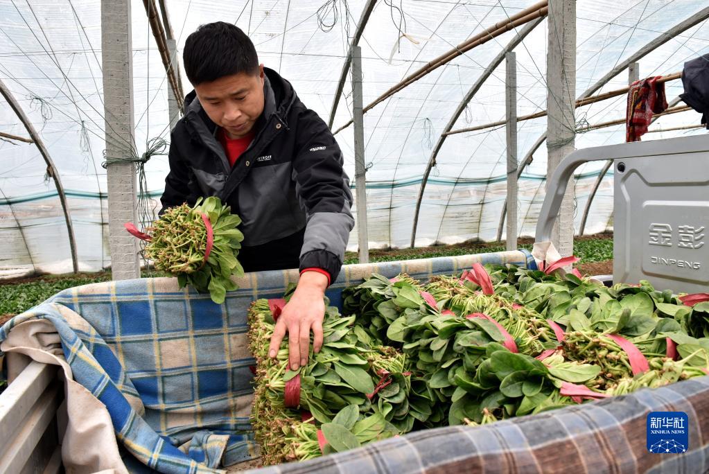 1月31日,在河北省邢臺市南和區賈宋鎮郄村,宋建飛把采收的菠菜裝車。