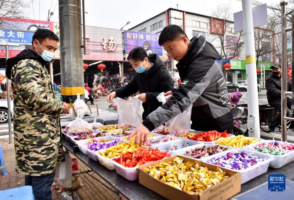 1月31日,在河北省邢臺市南和區的集貿市場,宋建飛(前右)在采購糖果。