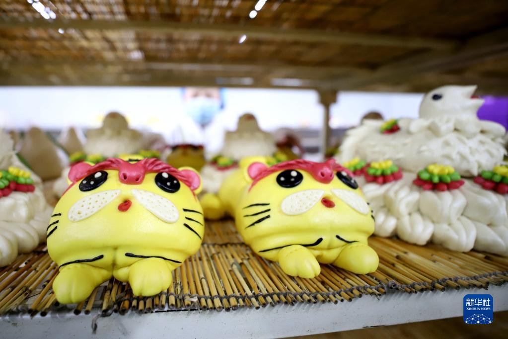 1月20日在山東省青島西海岸新區一家食品企業車間里拍攝的虎頭“年餑餑”。