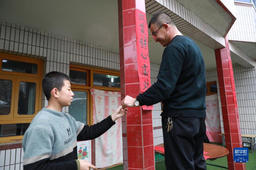 在蘭州市七里河區西果園鎮袁家灣村,村民馬明禎(右)和兒子在家中一起貼春聯(1月26日攝)。