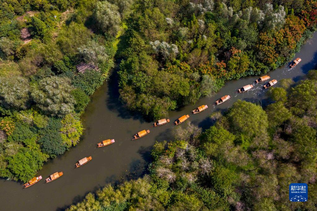 2021年10月3日,游客在江蘇省泰州市姜堰區溱湖國家濕地公園乘船游玩(無人機照片)。