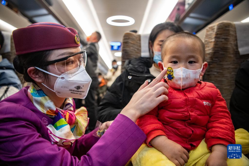 林夢凡(左)在成渝高鐵智能復興號“共青團號”列車上給小朋友的口罩貼上卡通貼紙(1月27日攝)。