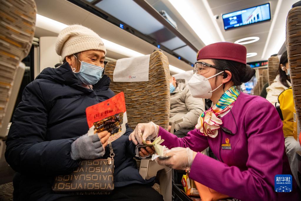 林夢凡(右)在成渝高鐵智能復興號“共青團號”列車上為購買小食品的老年旅客提供零鈔找現服務(1月27日攝)。