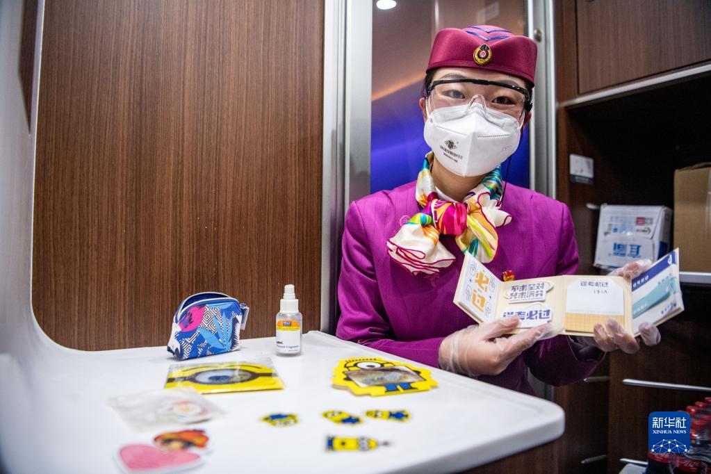 林夢凡在成渝高鐵智能復興號“共青團號”列車上展示““哆啦A夢口袋”里的小物件(1月27日攝)。