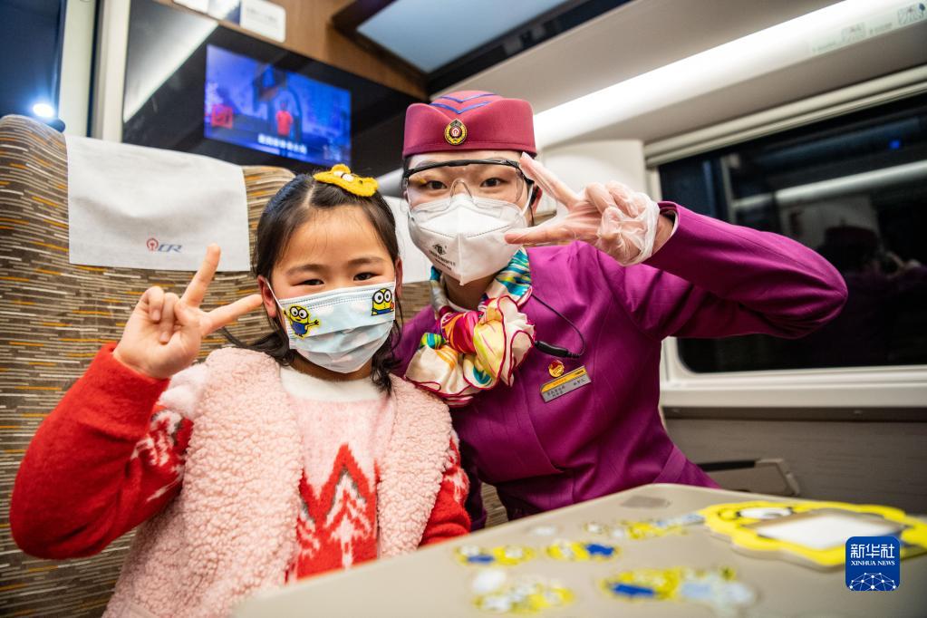林夢凡(右)在成渝高鐵智能復興號“共青團號”列車上和小朋友合影(1月27日攝)。