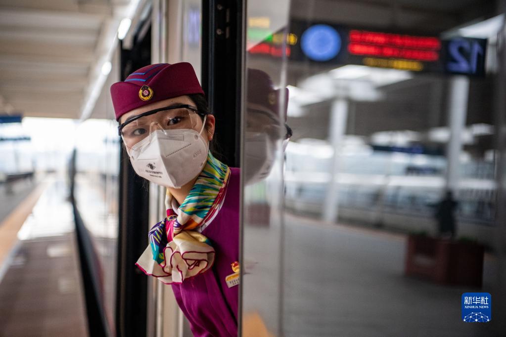 2月2日,在重慶北站,林夢凡在智能復興號“共青團號”列車發車前做準備工作。