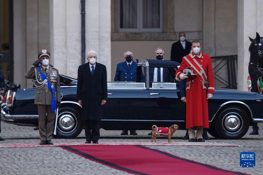 2月3日,在意大利羅馬,意大利總統馬塔雷拉(左二)抵達總統府時,受到總統衛隊吉祥物小狗的迎接。