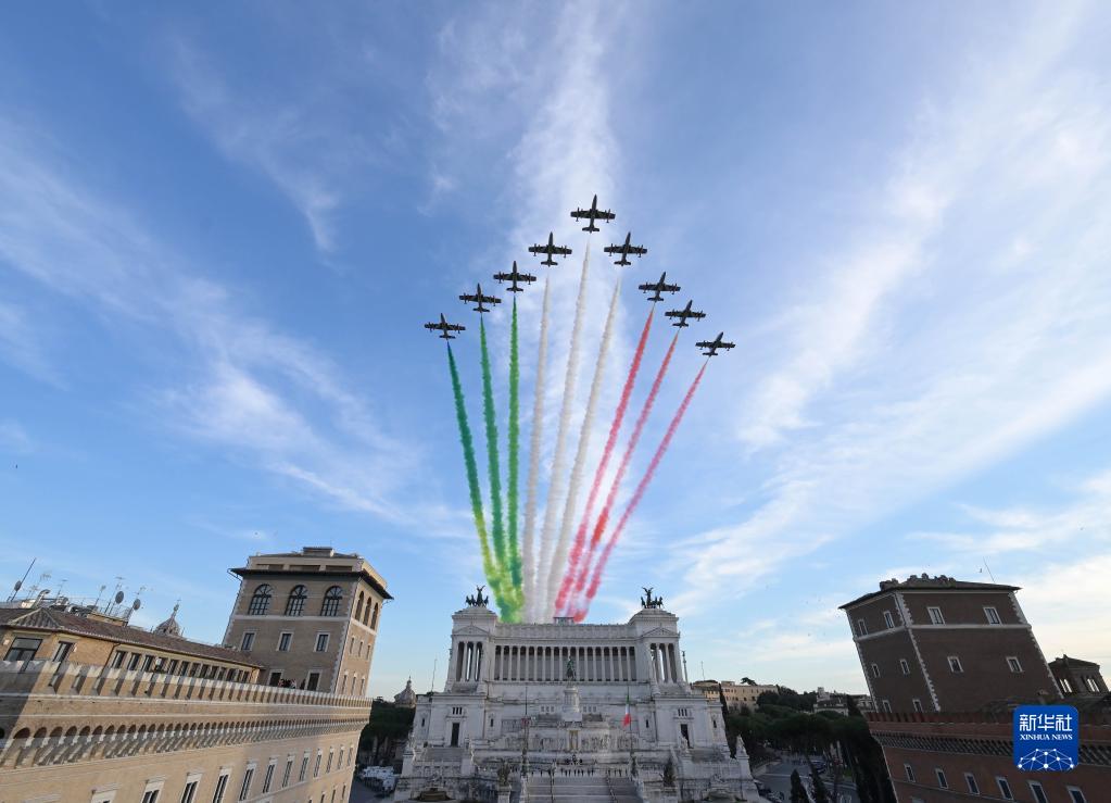 2月3日,意大利“三色箭”飛行表演隊噴出象征國旗三色的煙霧飛過羅馬上空,慶祝意大利總統馬塔雷拉就職。
