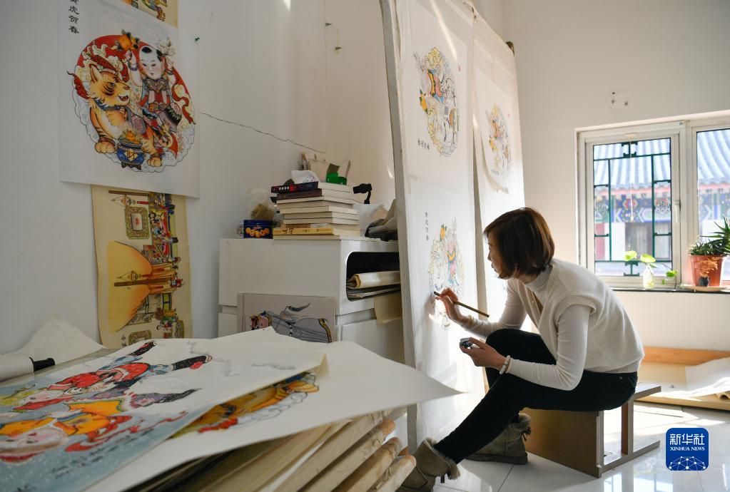 2月10日,天津楊柳青畫社青年傳承人王艷在彩繪工作室創作年畫。