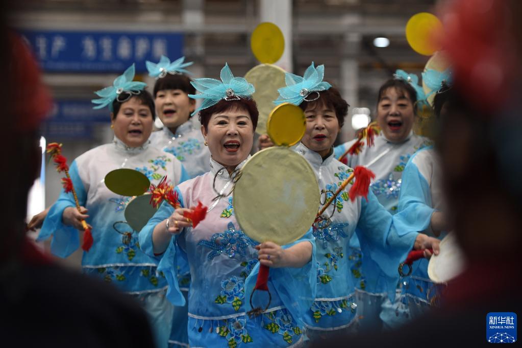 2月13日,在河北電機股份有限公司生產車間,石家莊市欒城區樓底農民工俱樂部成員在現場演出節目。
