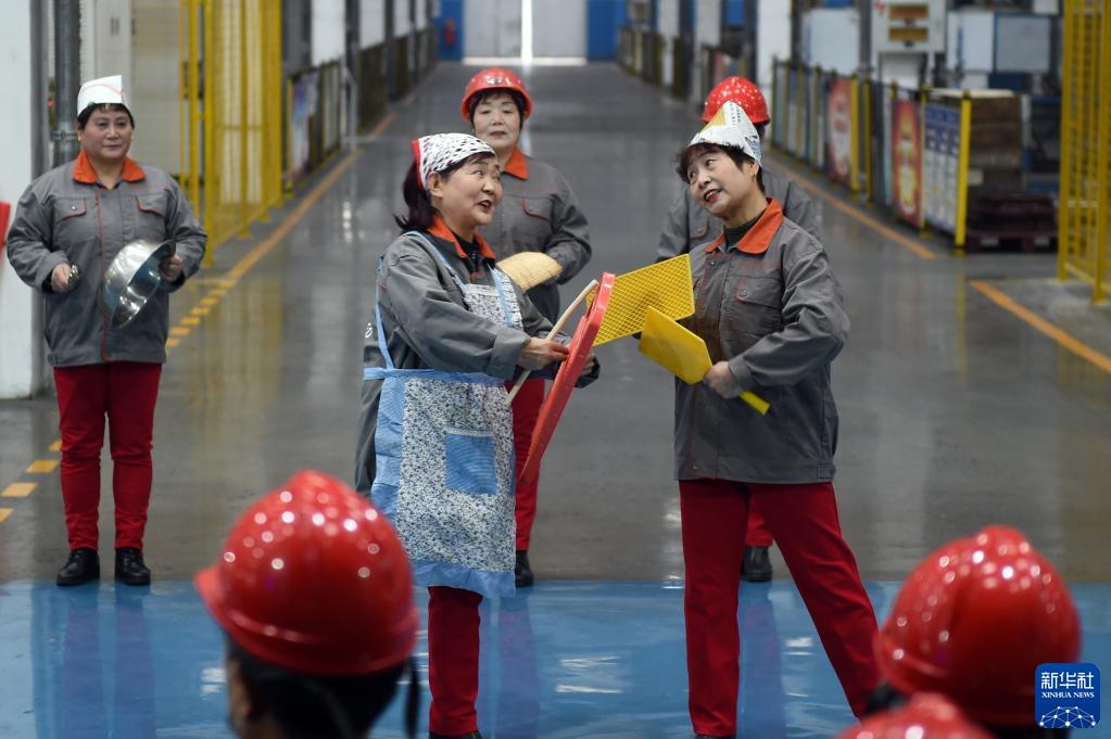 2月13日,在河北電機股份有限公司生產車間,石家莊市欒城區樓底農民工俱樂部成員在現場演出節目。