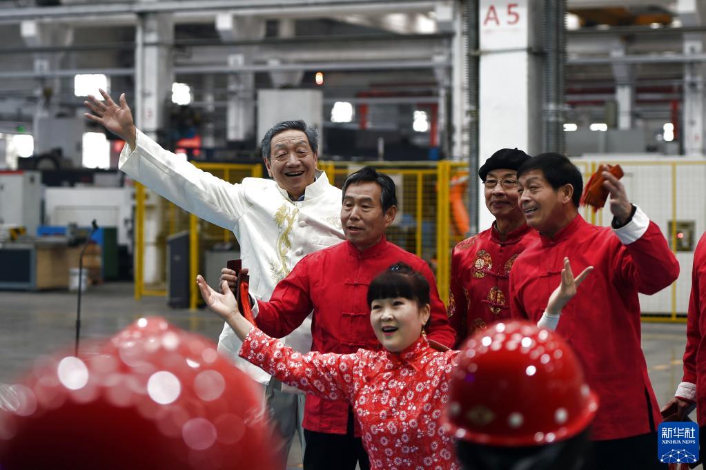 2月13日,在河北電機股份有限公司生產車間,李俊岐(左一)與石家莊市欒城區樓底農民工俱樂部成員在現場演出節目。