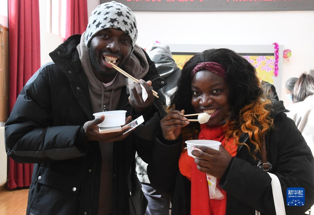 2月15日,在位于北京市海淀區中關村街道的華清園社區服務站,外國留學生在社區組織的慶元宵活動中品嘗湯圓。