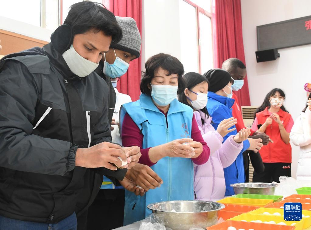 2月15日,在位于北京市海淀區中關村街道的華清園社區服務站,外國留學生與社區志愿者一起包湯圓。