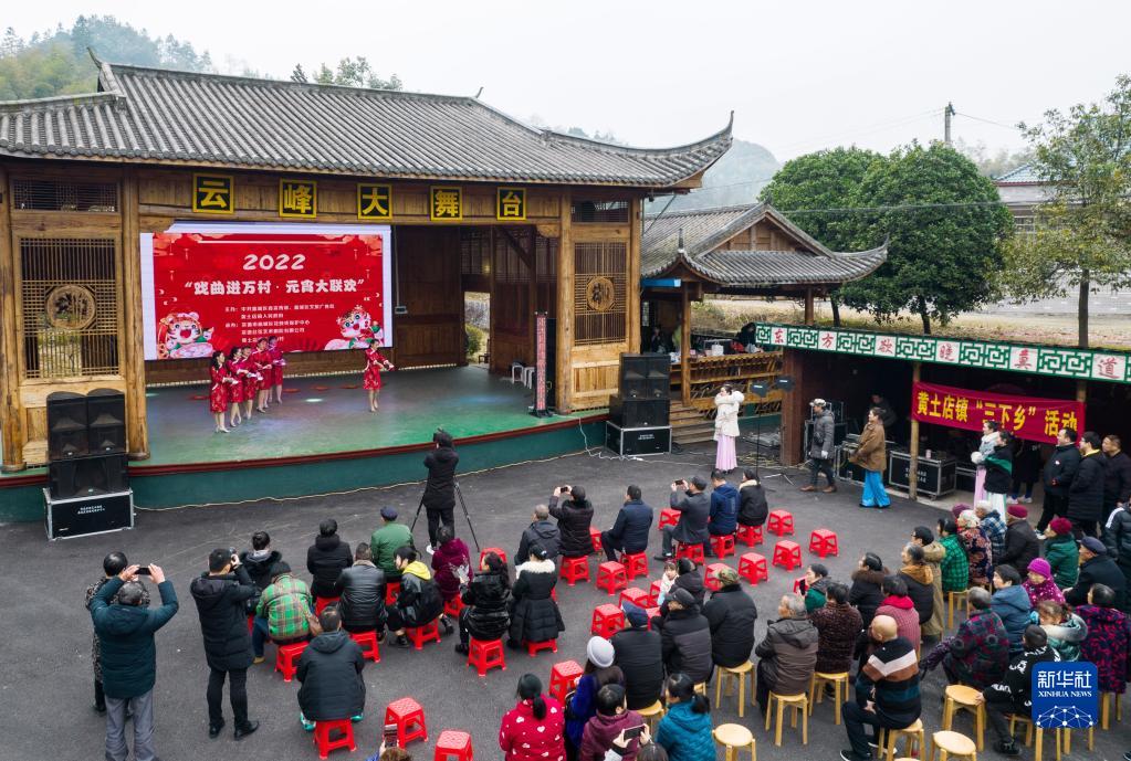 2月15日,湖南省常德市鼎城區花鼓戲保護中心演員在“戲曲進萬村·元宵大聯歡”送戲下鄉活動上演出(無人機照片)。