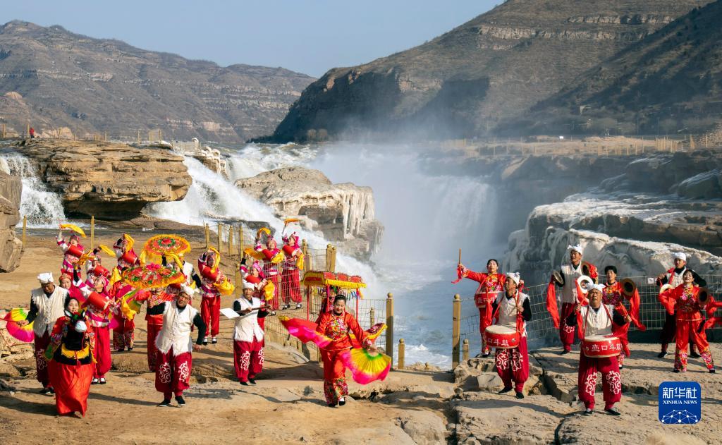 2月15日,民俗藝人在陜西壺口瀑布景區進行民俗表演。