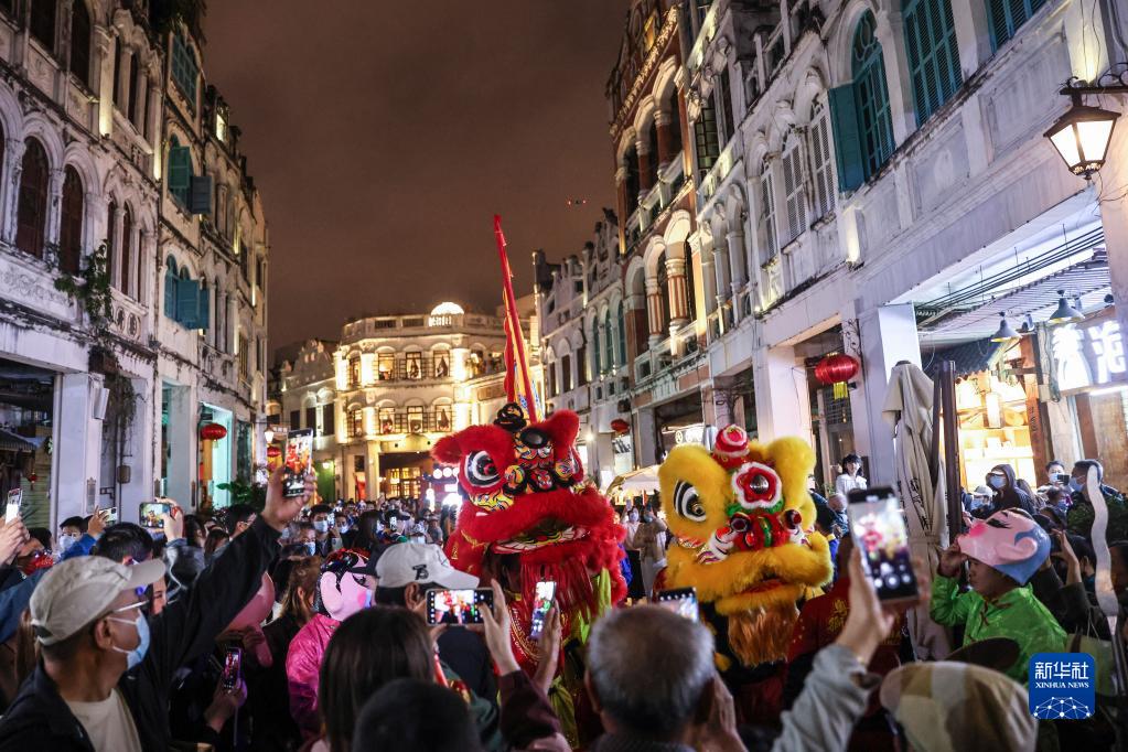 2月15日,游客在??诘尿T樓老街觀看舞獅表演。