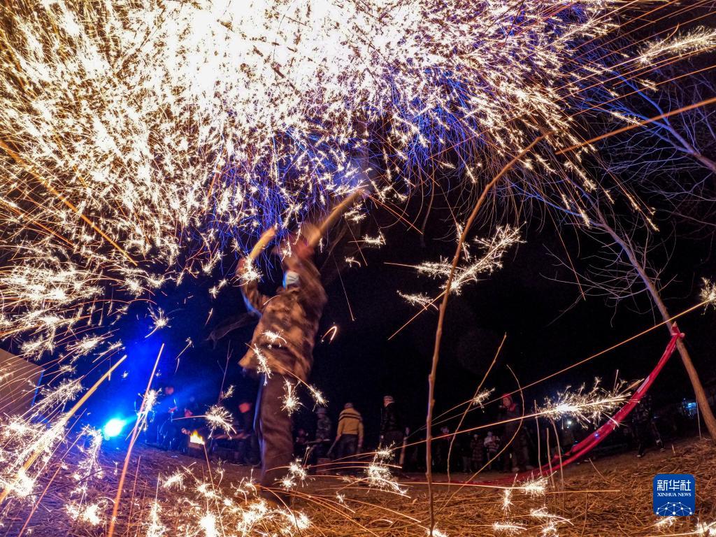 2月14日,山東省鄒城市大束鎮北葛村村民聚集在村口,用打鐵花的形式喜迎元宵節。